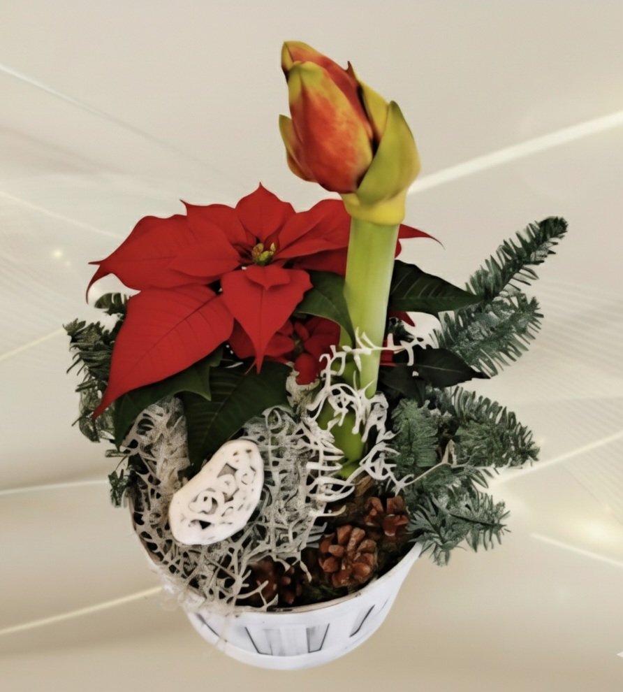 Kaunis jouluistutus korissa, jossa amaryllis, joulutähti ja vaihtuva lisukekasvi.