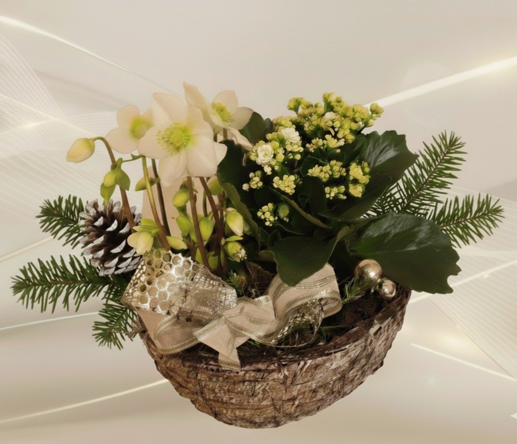 Kaunis istutus, jossa jouluruusu ja tulilatva. Korit vaihtelevat kaupan valikoiman mukaan.