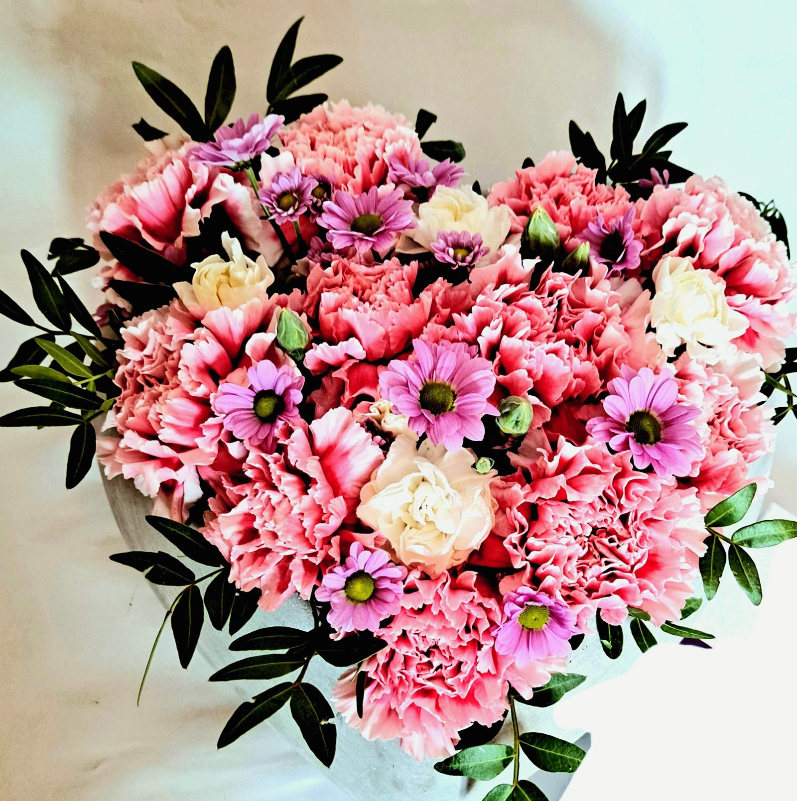 Kaunis sydän asetelma erilaisista kauden kukista. Valitse kukkien värisävy.